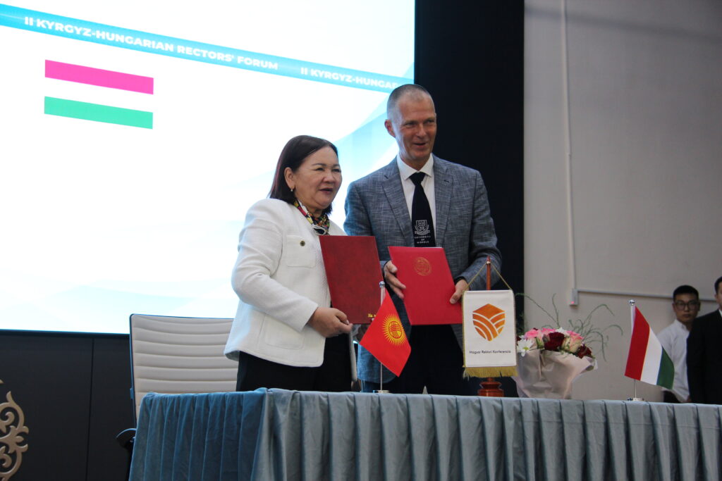 19 сентября 2025 года – в Бишкеке на базе Кыргызского национального университета им. Ж. Баласагына прошёлВторой Кыргызско-Венгерский форум ректоров, организованный Министерством науки, высшего образования и инноваций Кыргызской Республики при содействии высших учебных заведений Кыргызской Республики.Форум направлен на развитие сотрудничества между высшими учебными заведениями двух стран, обмен опытом в области науки, образования и инноваций, а также укрепление академических связей и культурного взаимодействия.В форуме приняли участие ректоры, представители университетов и научно-исследовательских учреждений Кыргызстана и Венгрии. В ходе мероприятия былиобсуждены ключевые направления сотрудничества, включая: